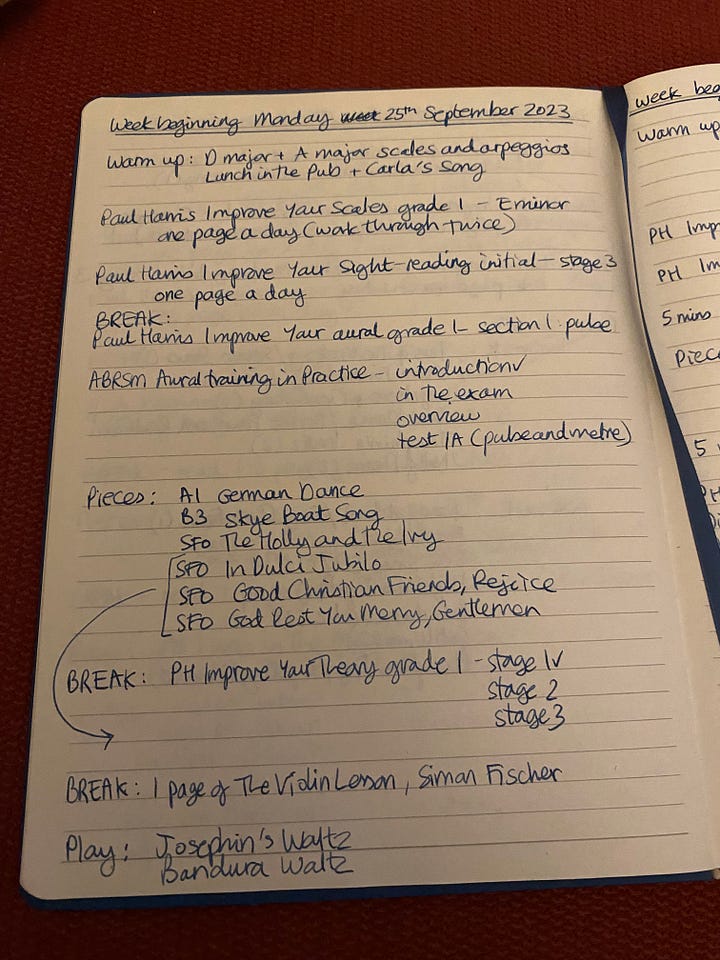 A year later I have made progress. I still can’t play the pieces I could play aged 16, but I wasn’t a particularly accomplished player then anyway. I spent much of my childhood in a confused daze, overwhelmed by a world I didn’t understand (I still don’t, but I’m better at figuring it out, at least some of the time), and that affected, I can see now, my ability to learn. I lacked any real understanding of what I was supposed to be doing on the viola (my first instrument) and then the violin, and had little understanding of music theory. This time round I am trying to build a stronger foundation - good playing technique (I really need to work with a teacher once I have a bit more time, energy and money - C, who runs the orchestra, is a fiddle teacher luckily), developing a more sensitive ‘ear’, building up my understanding of music theory…