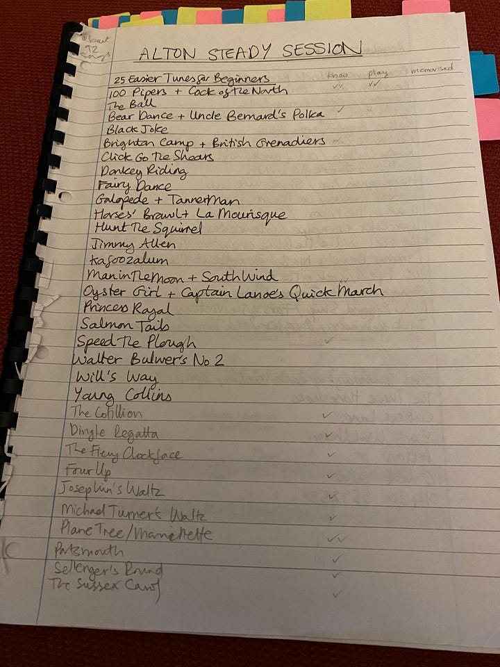 A while back I found a treasure-trove of recordings on Paul Hardy’s labyrinthine website. When his Cambridgeshire-based steady session was closed over the Covid lockdowns, he started recording pieces each week, and, when I am ready to learn more pieces by ear, I will use his now enormous library of recorded tunes, which you can find here. But, for now, my original plans to learn one new tune by ear each week have been abandoned.